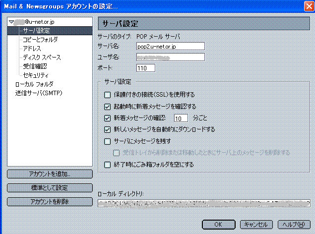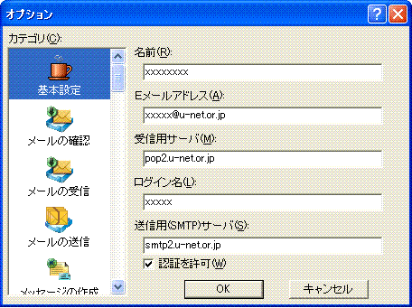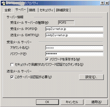 「受信用サーバ」に、"pop2.u−net.or.jp"を入力します。