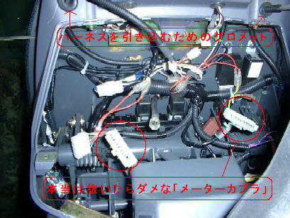 作業の邪魔になるのでメーターユニットを外すのに防水の為「抜いたらあきません」カプラーもキャビン付きなので、まぁここまで水をかぶるコトはなかろうと「自己責任」で引っこ抜いてメーターを取り外したついでにインパネをそっくり取り外したのが上の写真。ついでに配線用の穴をブチ抜いてグロメットをはめる。この期に及んでもう後戻りは出来なくなった。(穴ボコだらけ)