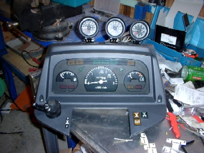 | とにかくインパネの上に取り付け。作業性向上の為掟破りのメーター外し。壊れても文句は言わん。(言えん) | 取りあえず完成の図。左から「油温計」、「電圧計」、「ブースト計」。左端は今後付ける(であろう)「油圧計」用 |