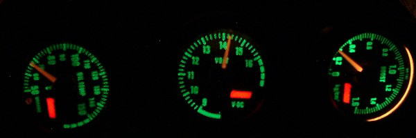 | 夜間作業時のメーターの様子。ピーク域が12時の位置になるように着けてあります。 油温70℃弱。電圧14.2V。ブースト0.3kg。 |