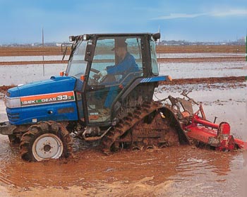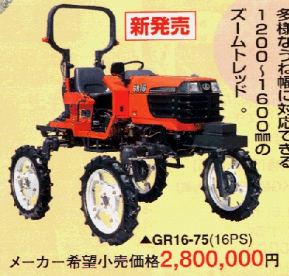 | こんなものがって言ったら失礼だけど280万円もする。畑作管理用で可変トレッド、通常、同相、逆相、後輪操舵の出来るマルチモード4WSでカニ走りや平行移動等乗ってみたら面白かった一台。でも水田では使えません。緊プロ対象商品。馬力あたり価格は破格の17.5万。 | 何故か最近ハヤリのハーフクローラタイプのトラクター。踏圧が低いって言うけど公道を走れない様な機械は却下。写真は33馬力のモデル。46馬力のTGS46CUPCYでお値段508.5万円から531万円まで。これも馬力11万円台。 |
