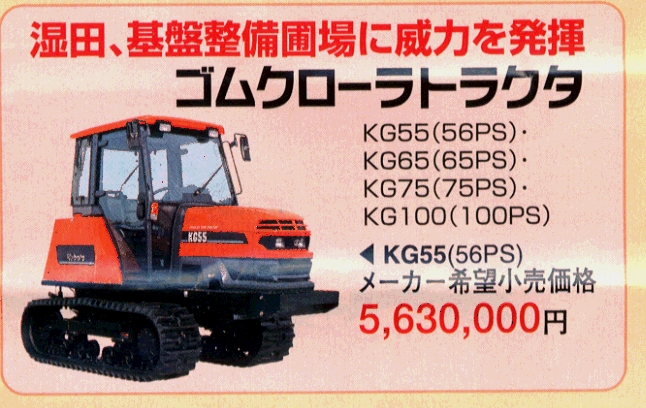 | フルクローラタイプのトラクター 三菱MKM55、56馬力でお値段563万円。 | クボタのフルクローラタイプ KG55、56馬力で価格は左と同じ563万円。三菱よりOEM供給を受けており左の機種と色が違うだけでまるっきり同じもの。これで値段が違ったら怒るよ。おそらく井関も三菱からOEMで供給してもらっているので同じもののはず。 |
