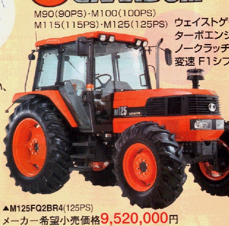 | 井関 TA−C120S こちらは120馬力のモデル。デザインは上の2台と一緒なのがお解りかと。お値段923万円。馬力あたりだと7.7万円弱。 | クボタのフラッグシップモデル。125馬力モデルで952万円。次期主力戦闘機に導入を考えているのがこれの90馬力モデルでお値段798万円。ここまで来ると馬力8万を切り約7.6万円、90馬力モデルで8.8万円。 |