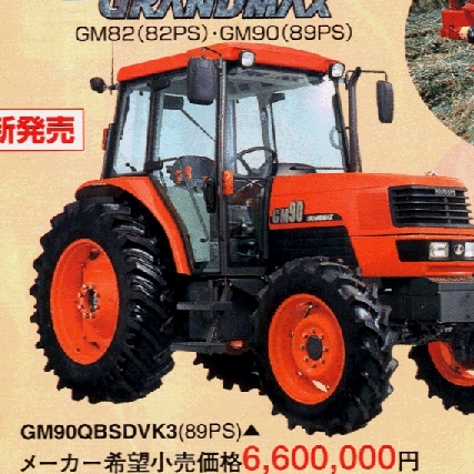 | クボタGM64 現在の水田用の主流機。64馬力で673万だから馬力あたり10.5万円。小型機とは異なり作業機は別。あくまで本体価格。一般に使われている小特30馬力クラス以下だとキャビン、ロータリー付きで馬力あたり13万円くらい。 | 昨年発売になった左モデルの82、89馬力モデル。装備にもよりますが馬力が40%アップでもこっちの方が安い。大幅にグレードのリストラをやったらしく左同様90以下は7桁。一番高いのは800万を超えていたハズそれでも馬力9万。 |