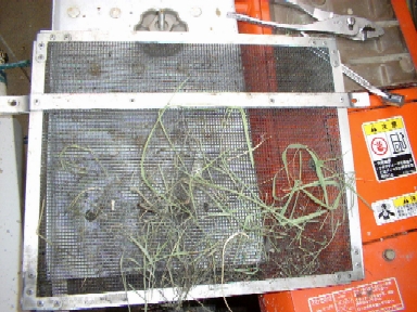 | こんな状態で稲の葉を吸い込んでしまう。写真右下に見える黒い太い筒状のはステアリングシャフト。ダストスクリーンは装着済み。 | 約3ヘクタールの散布でこれだけのゴミを吸い込む。(2003年撮影) |