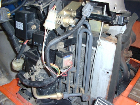 ダストスクリーンでゴミをくい止めてしまえばラジエターのコアへ細かいゴミの吸い込みは防げる。あとは機械の下へ潜ってゴミ等の異物が確認されれば(どうかするとエンジンフードの脇から葉っぱが覗いている時も)写真のようにバラして掃除すればオーバーヒートにまでは至らない。とりあえずはこれでおっけ。でも実際問題として水温がどのレベルまで上がっているかは水温計がないので不明。