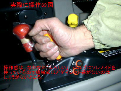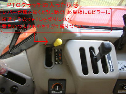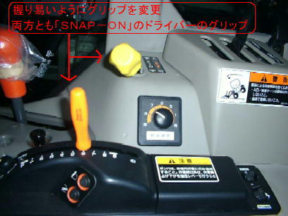 | PTOレバーが標準位置だと「ON」の状態が上の写真のようにBピラーに近づき過ぎて「切りにくい」これは、実際問題、「安全上よろしくない」 | 「ポジションつまみ」を「握れるサイズ」に、PTOレバーの角度をややオフセット。ともに取り付けたのは手持ちの「SNAP−ONのドライバーの柄」 |