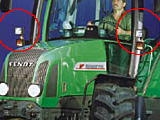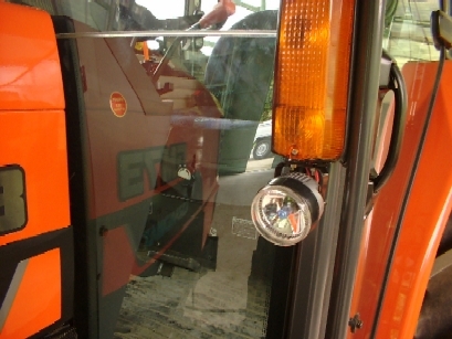 図中○印内、ヨーロッパ製トラクターに必ず付いている。左から、フェント700、ニューホランドTM(旧フォード)、ファーガソン4270、ランボルギーニビクター。当然ヘッドライトとルーフにも作業灯が2−4灯装備。ランボルギーニビクターに至ってはヘッドライトの上に5灯も補助灯を装備しているのd、計11灯!。一体オルタネータの容量(発電量)は如何ほど?ちなみにフェント900系のオルタネータの容量は、14V、144Aつまり2kwもある。言い換えれば2.6馬力のモーター。ほとんど無敵やな