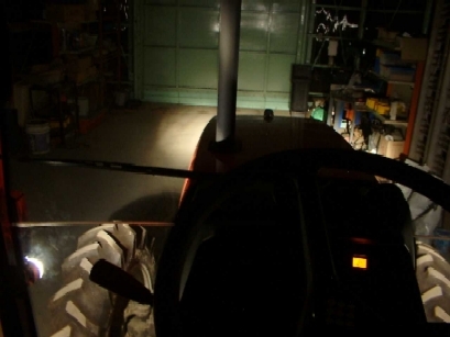 上の左の写真のヘッドランプのみの場合は、足許が見えないので作業時に決して見易い配光ではない。右写真のルーフの作業灯点灯時が通常の夜間作業の状態。足許が見える分は幾分見易い。しかしエンジンフードからの反射光が目障り。
