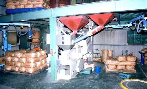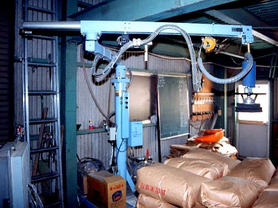 | 中央の灰色の機械がもみすり機、(ロール幅6インチ処理能力45俵/時間)その背後に米選機があり一旦二階のタンクへ上げてそこから落として計量後、写真左側の様に30kg袋に詰めパレットに。 | 左写真の両端にあるアーム状の物体はこれ、負圧で30kg米袋を吸い上げパレット上で投下。アイコクアルファ社製「ラクラクハンド」ホンマ楽チン。これは発売の年にモニター価格で買った最初期モデル。今のと若干仕様が違う。 |