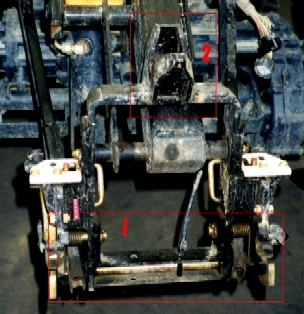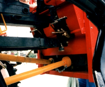 | クイックヒッチ部。「1」がロアリンク。「2」がトップリンク。共にフック式の為作業機をすくい上げてドッキング。PTOシャフトもスプライン式でワンタッチ。規格モノのヒッチのため管理作業用の機械はメーカーを問わず装着可能。いわゆる「流派超越合体」が可能。ちなみに田植のみの一般機は取り外す必要がないため完全固定式。で右が散布機に合体変形したもの。 | |