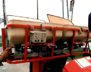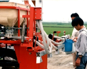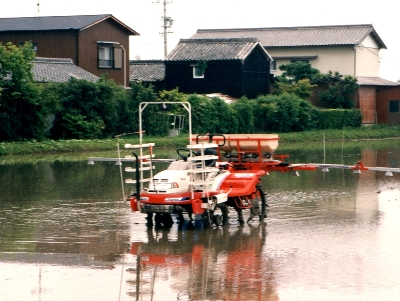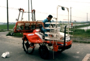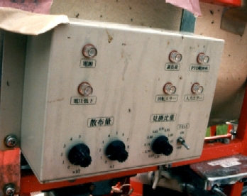 | 「これや、これ。俺が欲しかったんは。」と言わしめたプロトタイプのマシン。田植機の本機の装着、散布幅7.5m、散布調整幅1.2m。散布量1kgー60kgまで1kg刻み。 | |